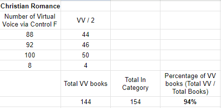 I took each number of Virtual Voice and put that into the total number of books in that subgenre.
